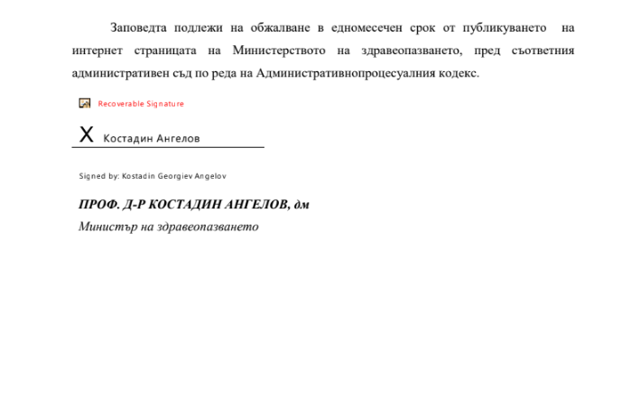 Това нарежда министърът на здравеопазването проф. Костадин Ангелов с издадена днес заповед.