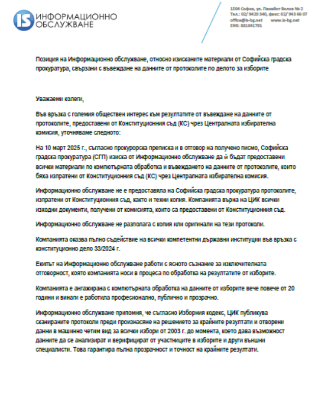 Информационно обслужване излезе с официална позиция относно изисканите материали от Софийска градска прокуратура, свързани с въвеждане на данните от протоколите по делото за изборите.