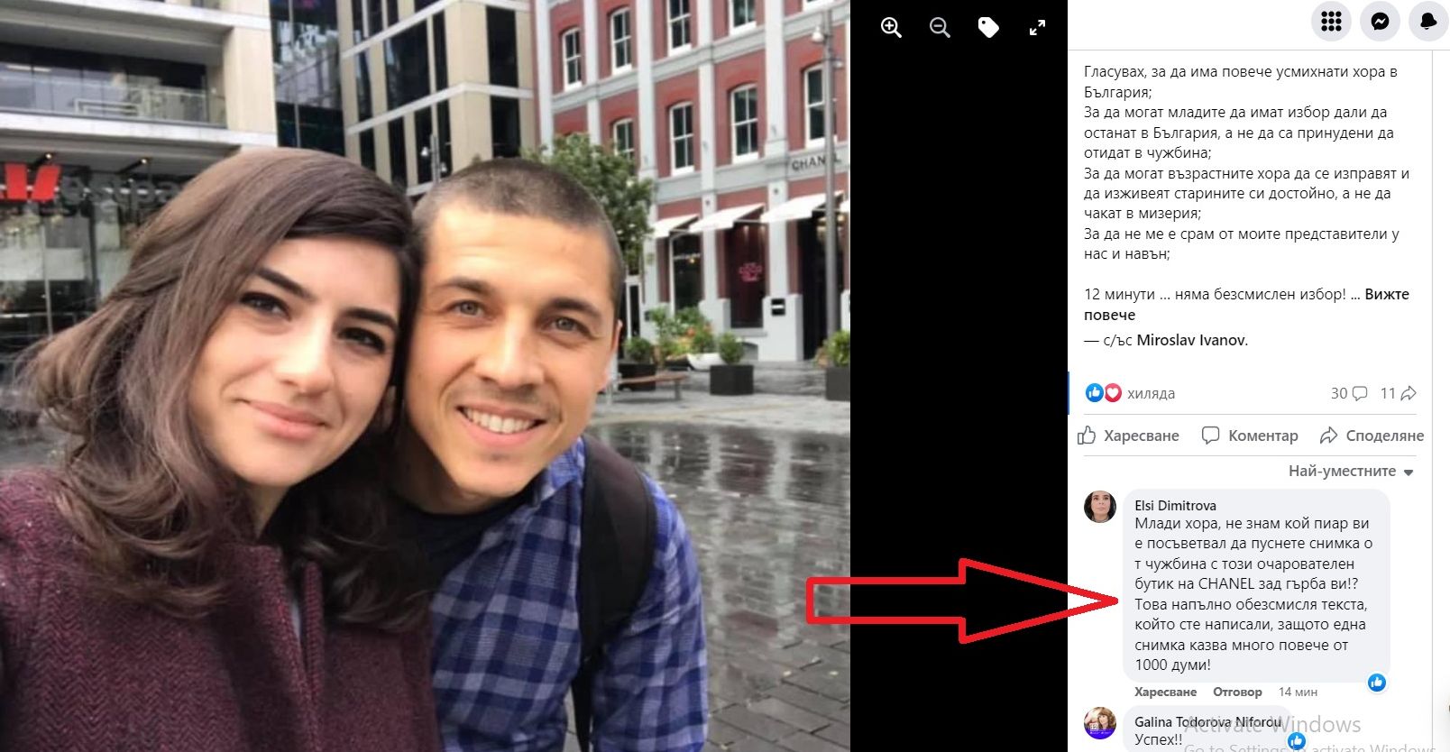 "Млади хора, не знам кой пиар ви е посъветвал да пуснете снимка от чужбина с този очарователен бутик на CHANEL зад гърба ви!? Това напълно обезсмисля текста, който сте написали, защото една снимка казва много повече от 1000 думи!", засече говорителката на Петков дама на име Елси Димитрова.