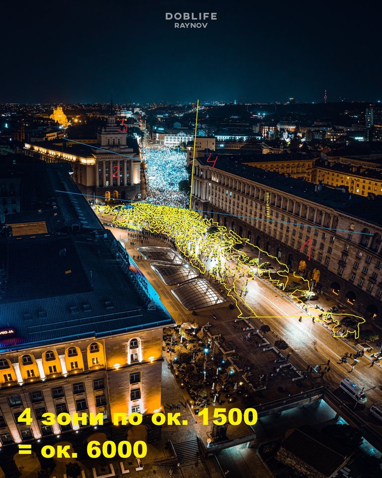 "Позволил съм си да преброя само 1/4 от пространството. Ок. 1/4 от него не се вижда на този кадър (но се вижда на много други). В щрихованата преброена зона има приблизително 1500 човека. Има още 3 зони с приблизително същите размери. Може да се каже, че на площада снощи е имало приблизително... отговорът във втората снимка", написа Димчев.