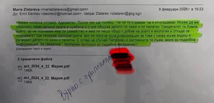 Точно тези два тежки въпроса се появяват, след като майката на детето – Мария Златарева, изпраща имейл до Емил Дечев на 9 февруари 2026 г. – седмица, след като бяха открити първите три трупа в аферата “Петрохан”, и само ден след намирането под връх Околчица на кемпера с телата на самоубилия се Ивайло Калушев и на застреляните от него Николай Златков и Александър Макулев.