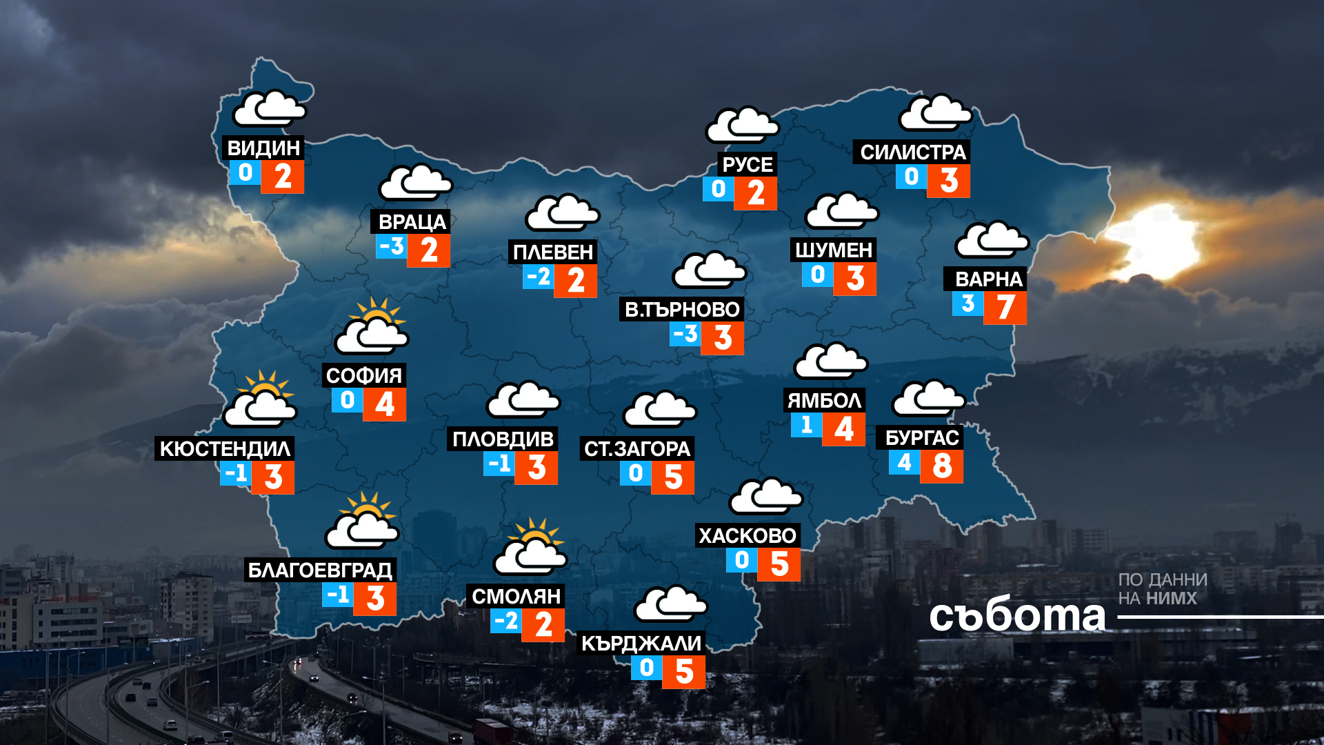 Вятърът ще е южен, по-осезаем в неделя следобед и привечер. Температурите сутрин – около и малко под нулата, през деня в събота – между 4 и 9-10 градуса, в неделя – до 15 в Югоизтока. В районите с трайна ниска облачност или мъгла, и през двата дни ще е студено с температури дори в топлите часове между 0 и 5 градуса.