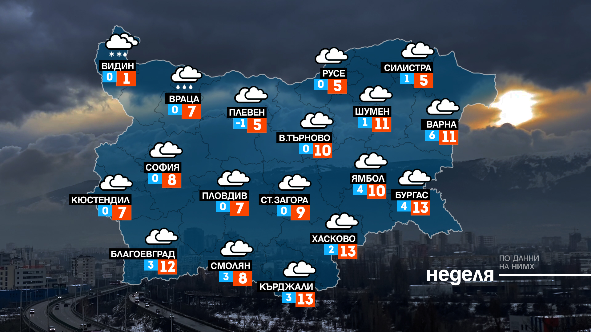 Температурите, както през почивните дни, така и след това, няма да падат драстично. Сутрин ще се колебаят от 0 до към 5 градуса, денем – между 8 и 13 градуса, до 15 в отделни точки на страната.