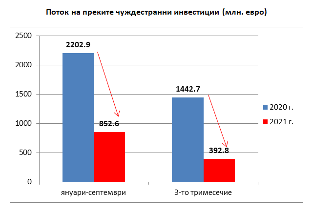 За периода януари-септември потокът на преки инвестиции е в размер на 852.6 млн. евро, като намалява с 1350.2 млн. евро спрямо този за януари – септември 2020 г. Тогава потокът от инвестициите е в размер на 2202.9 млн. евро. Сривът в потока на преките чуждестранни инвестиции е в размер на 61.3%.