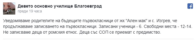 Девето училище в Благоевград има между 12 и 14 места за първолаци. Децата ще бъдат приети при едно условие - да не са от ромски произход, пише в социалната мрежа.