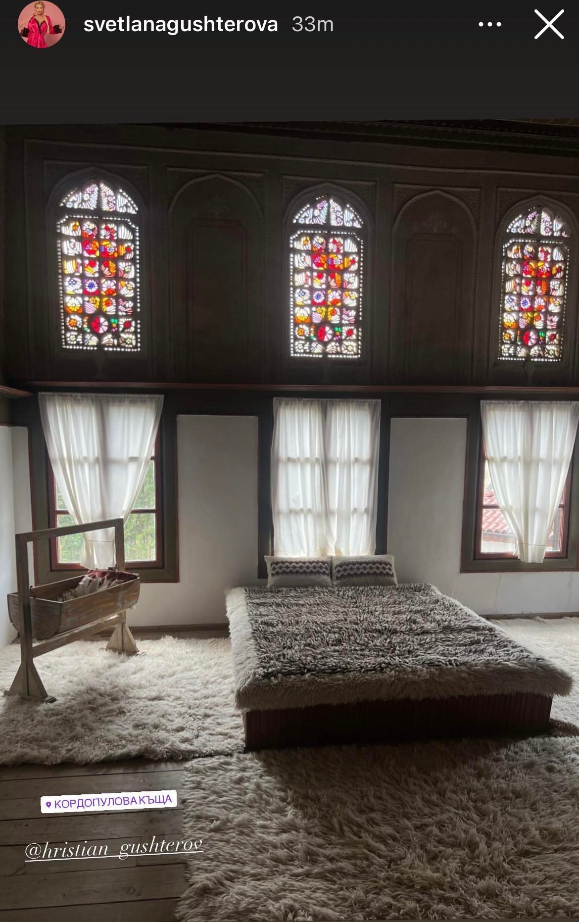 Явно на връщане от гръцката им почивка, Гущерова и мъжът й Христиан са направили спирка в Мелник, за да разгледат венецианските стенописи, дърворезби и стъклописи в къщата-музей, както и огромните й бъчви за съхранение на мелнишко вино, пише "Хотнюз".
