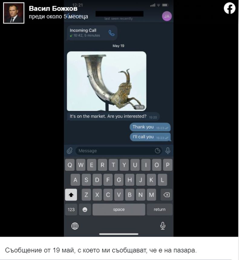 В средата на май месец Васил Божков публикува във Фейсбук снимка на един от ритоните, иззети от офиса му в сградата на „НОВЕ ИНТЕРНАЛ" ЕООД, като твърдението към нея беше, че разследващите са допуснали въпрсният артефакт да бъде предложен на търг и продаден.