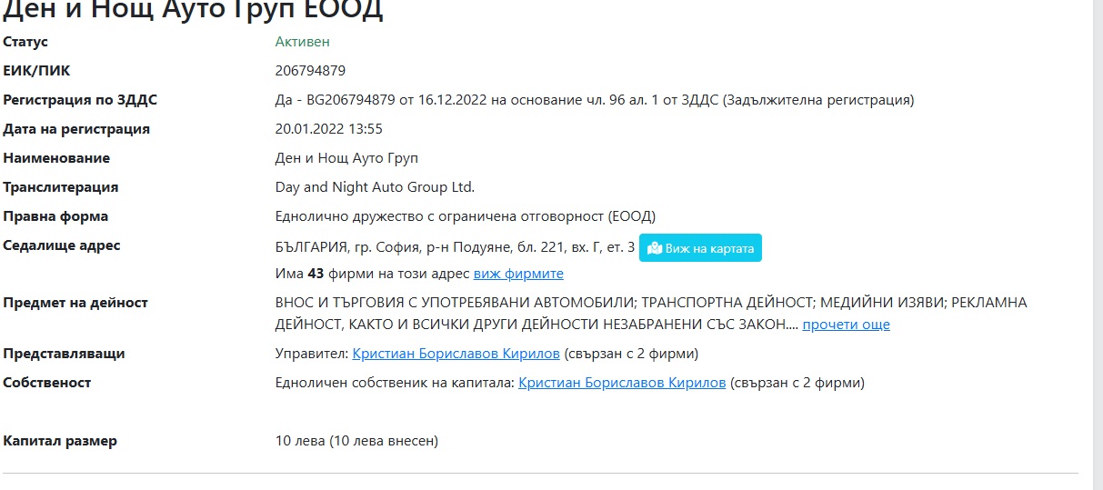 Справка в интернет показва, че Митака от "София ден и нощ" е едноличен собственик на капитала на въпросната автокъща.