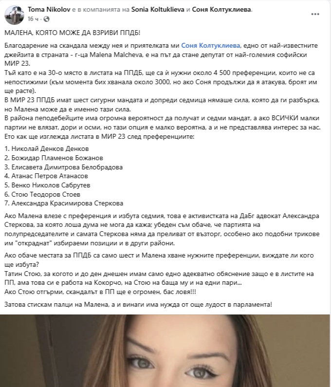 Благодарение на скандала между нея и приятелката ми Соня Колтуклиева, едно от най-известните джейзита в страната - г-ца Malena Malcheva, е на път да стане депутат от най-големия софийски МИР 23.