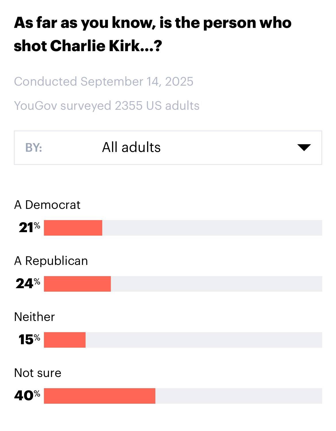 Дезинформационната кампания пожъна успех. 24% от американците вярват, че убиецът на Чарли Кърк е републиканец. Без абсолютно никакви доказателства за това.