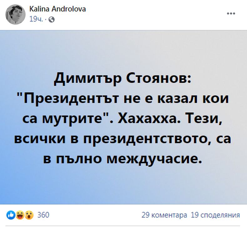 "Димитър Стоянов: "Президентът не е казал кои са мутрите". Хахахха. Тези, всички в президентството, са в пълно междучасие." Това написа в профила си във "Фейсбук" журналистката Калина Андролова. Повод за гнева й е вчерашното неадекватно изказване на главният секретар на Радев в ефира на БТВ, че "президентът не е посочил категорично кои са мутрите във властта, дали от ГЕРБ, дали от БСП, дали от ДПС."