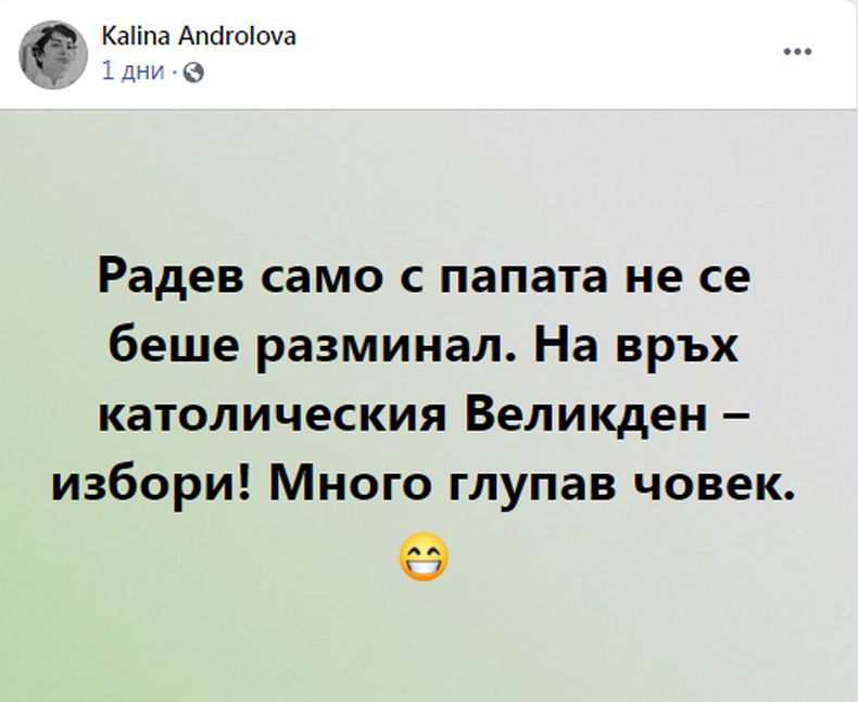 "Радев само с папата не се беше разминал. На връх католическия Великден – избори! Много глупав човек", написа тя.