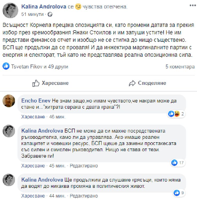 "Ако имаше реален капацитет и човешки ресурс, БСП щеше да замени простакесата със силен и смислен ръководител. Нищо не става от тези. Забравете ги!", написа анализаторът Калина Андровова във фейсбук като коментар на вчерашния инфарктен пленум на столетницата. Според нея корнелия Нинова прецакала опозицията.