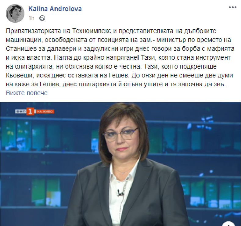 "Нагла до крайно напрягане! Тази, която стана инструмент на олигархията, ни обяснява колко е честна. Тази, която подкрепяше Кьовеши, иска днес оставката на Гешев. До онзи ден не смееше две думи на каже за Гешев, днес олигархията й опъна ушите и тя започна да звъни като струна срещу Гешев. Да не вземат и нея да я разследват за непочтена приватизация?!". Така изригна срещу корнелия Нинова в профила си във "Фейсбук" журналистката Калина Андролова.