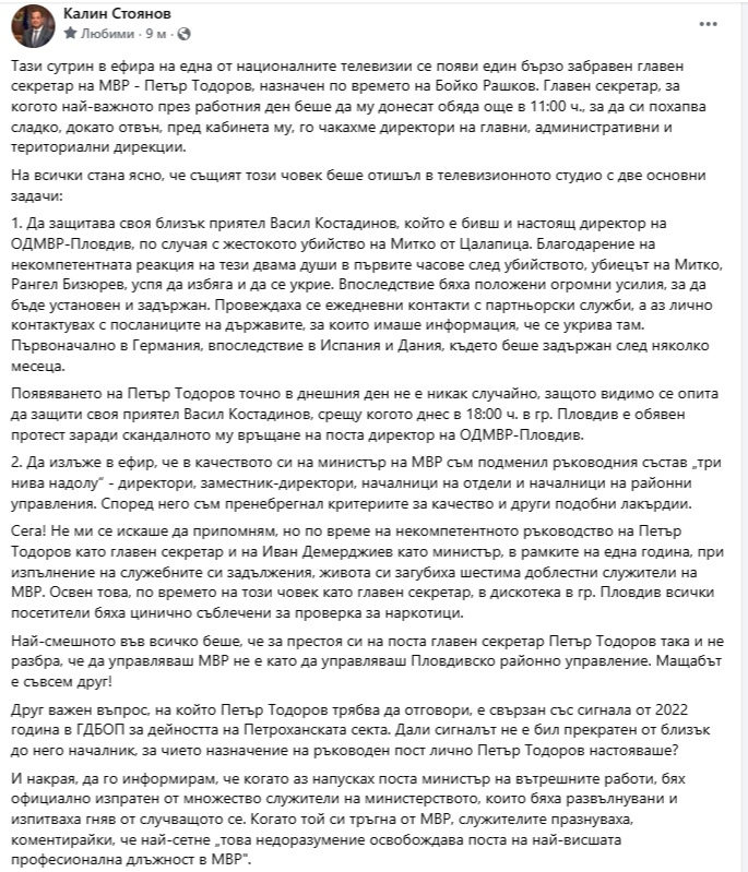Появяването на Петър Тодоров точно в днешния ден не е никак случайно, защото видимо се опита да защити своя приятел Васил Костадинов, срещу когото днес в 18:00 ч. в гр. Пловдив е обявен протест заради скандалното му връщане на поста директор на ОДМВР-Пловдив.