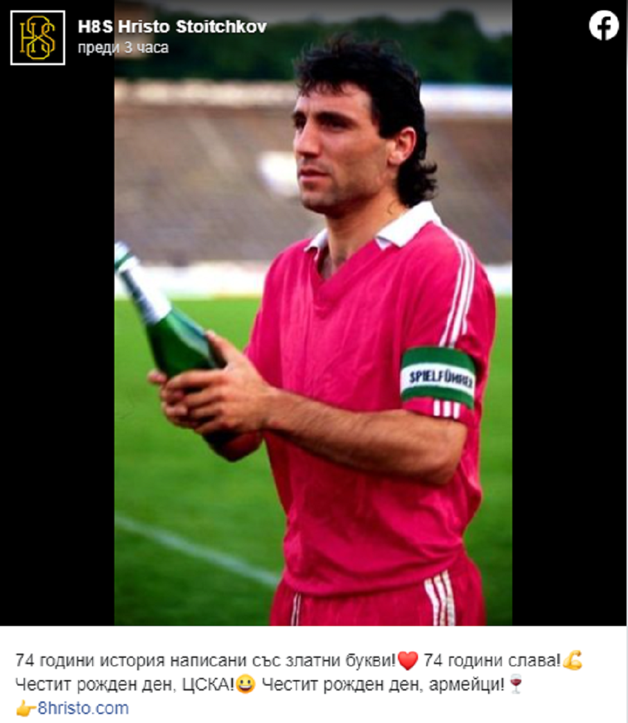 "74 години история написани със златни букви! 74 години слава! Честит рожден ден, ЦСКА! Честит рожден ден, армейци", написа Стоичков в социалните мрежи.