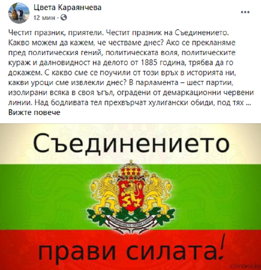 Честит празник, приятели. Честит празник на Съединението. Това написа във Фейсбук бившият председател на парламента Цвета Караянчева.