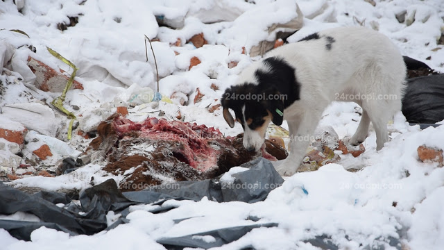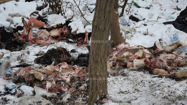 Кокали, кожа, карантии на прасета и телета са разпилени край дърветата, а снегът е почервенял от кръв, съобщава "Родопи24". Бездомни кучета пък си устройват угощения от поредното престъпно човешко деяние. Незаконното сметище за животински останки се намира току до табела с почти изтъркан надпис „За изхвърляне на отпадъци - глоба 500 лева”.