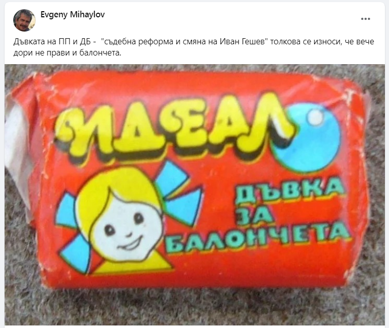 Дъвката на ПП и ДБ - "съдебна реформа и смяна на Иван Гешев" толкова се износи, че вече дори не прави и балончета. Това коментира на страницата си във Фейсбук кинорежисьорът Евгений Михайлов.