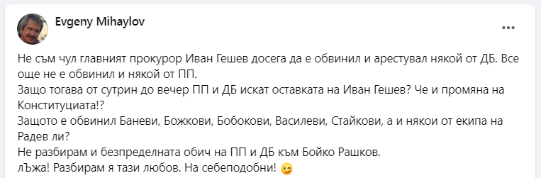 Не съм чул главният прокурор Иван Гешев досега да е обвинил и арестувал някой от ДБ. Все още не е обвинил и някой от ПП.