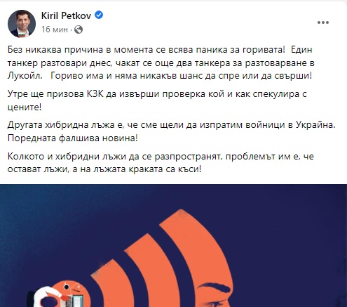"Един танкер разтовари днес, чакат се още два танкера за разтоварване в Лукойл. Гориво има и няма никакъв шанс да спре или да свърши! Утре ще призова КЗК да извърши проверка кой и как спекулира с цените!", посочва още Кирил Петков.
