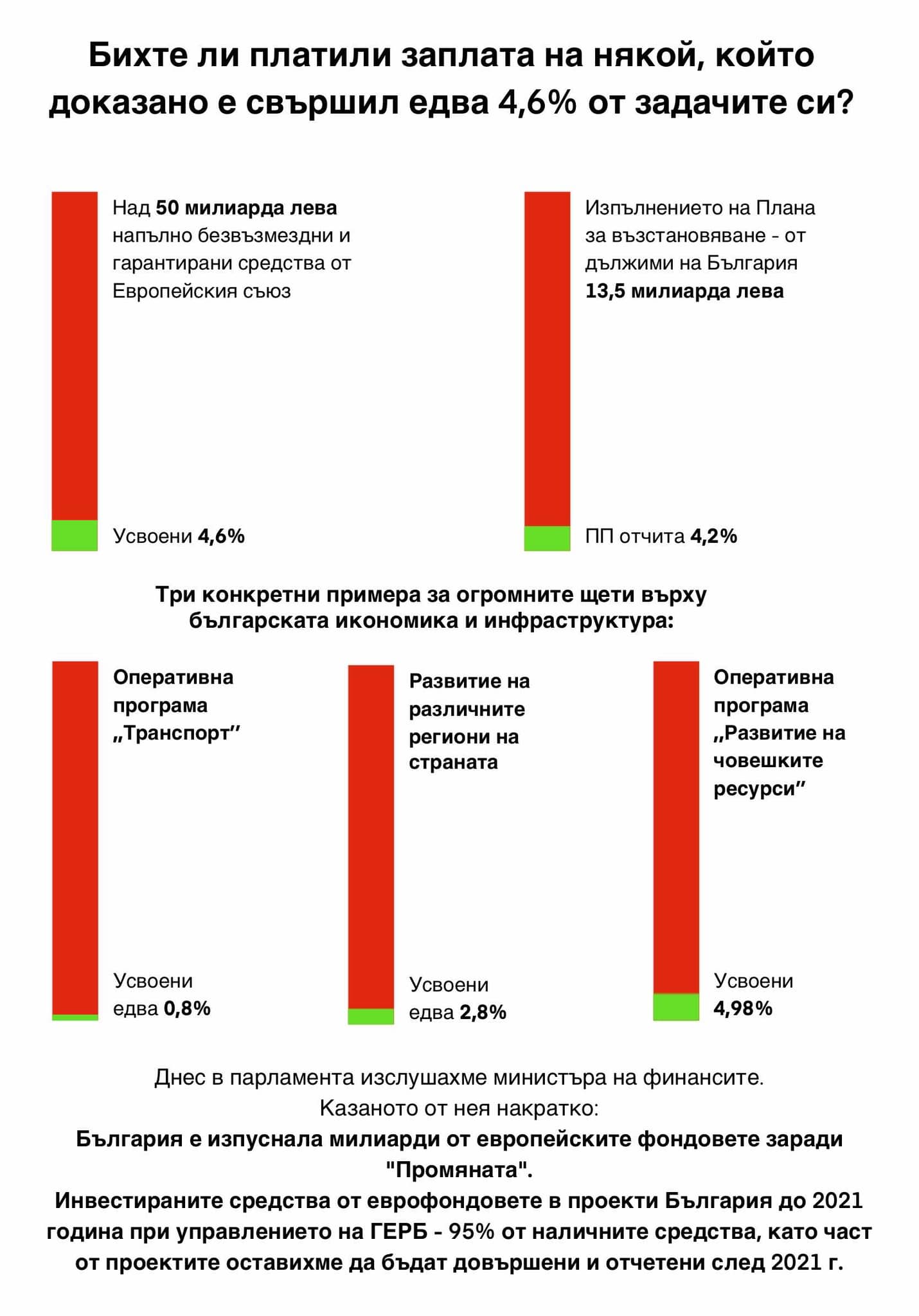 Идва Промяната и тя е налице - от 2021 г. досега, при гарантирани над 50 милиарда лева за България до 2027 г., успешно са разплатени едва 4.6%. Толкова - 4.6%, а сме в средата на програмния период, което означава, че ако няма скоро правителство, ще изгубим огромна част от тези безвъзмездни над 50 млрд. лева.