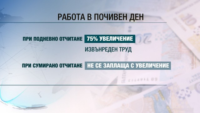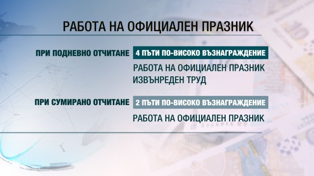 За работещите по график при сумирано отчитане на работното време за този ден не се заплаща извънреден труд, тъй като при тях извънредният труд се заплаща с не по-малко от 50% увеличение едва в края на периода, за който е въведено сумираното отчитане, ако е установено наличието на такъв. Те трябва да получат увеличение на подневното си възнаграждение само заради работа на официален празник, т.е. двойно.