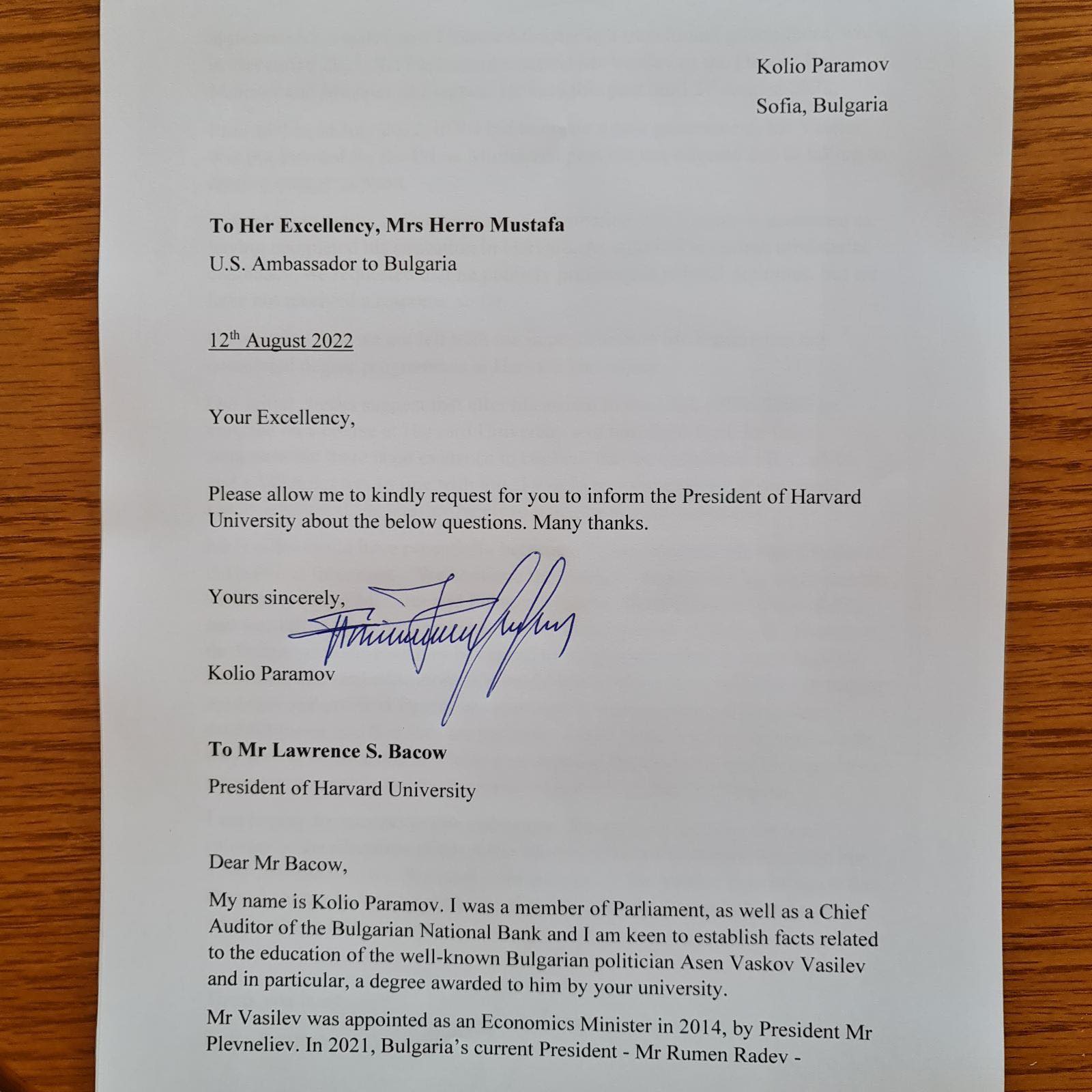 Кольо Петков Парамов, ексдепутат от 36-ото Народно събрание и ексглавен ревизор на Българска народна банка изпрати официално запитване до Харвард завършил ли е Асен Василев престижния университет.