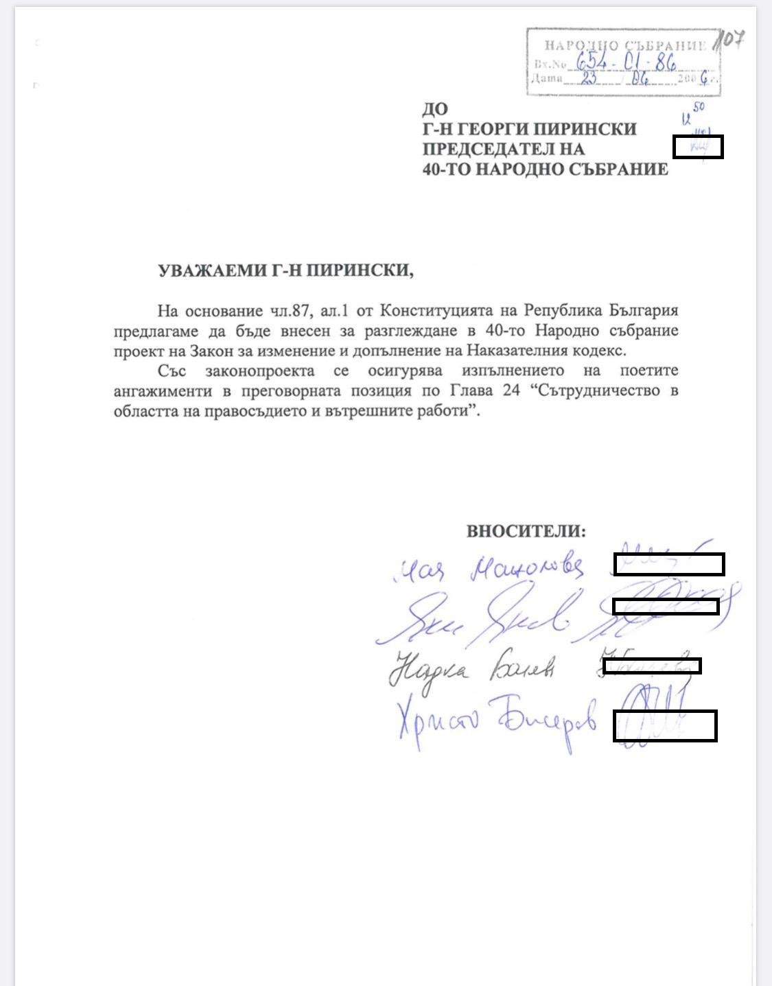 Обвинявана за предлагане на поправката е основно депутатът от БСП Татяна Дончева, тъй като, въпреки, че не е присъствала на първото заседание на правната комисия, когато поправката е отхвърлена, тя изрично иска прегласуването ѝ на следващото заседание. От друга страна, видно от архива на Народното събрание, законопроектът е внесен и мотивиран от Мая Манолова (БСП), Яни Янев (НДСВ), Надка Балева (БСП) и Христо Бисеров (ДПС). Поправката влиза в сила от октомври 2006 г. след публикуването на промените в закона в Държавен вестник.
