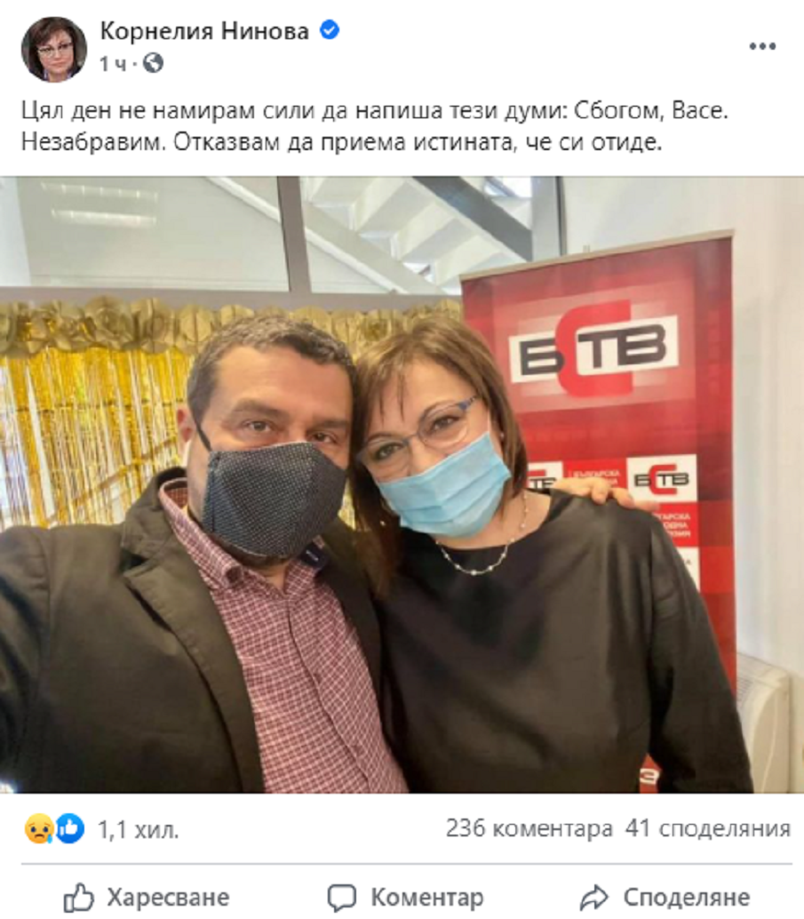 Корнелия Нинова публикува емоционален пост във Фейсбук в памет на пиара на БСП Васил Самарски. Той почина снощи след продължително боледуване от COVID-19.