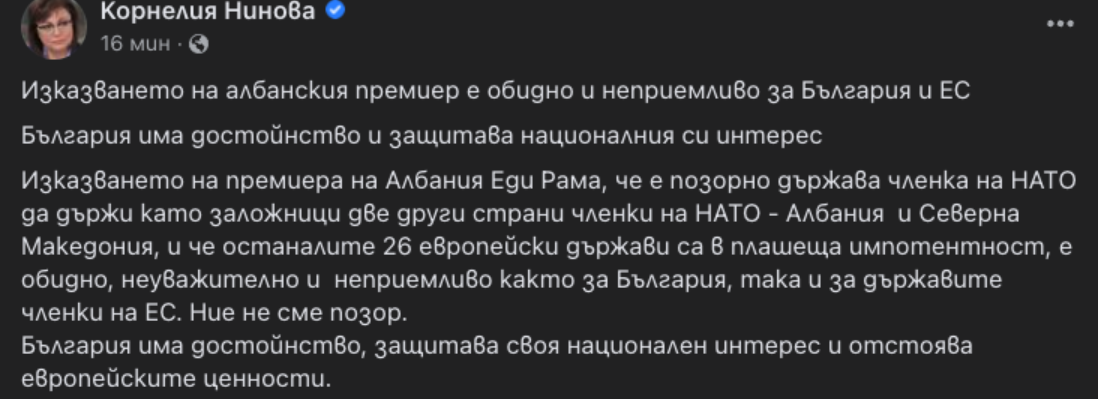 Изказването на албанския премиер е обидно и неприемливо за България и ЕС. България има достойнство и защитава националния си интерес. Това заяви лидерът на БСП и министър в оставка Корнелия Нинова във Фейсбук по повод вчерашното изказване на албанският премиер Еди Рама.