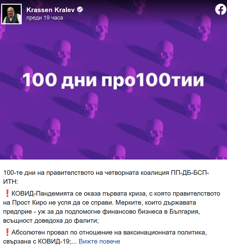 Бившият спортен министър Красен Кралев излезе с коментар за 100-те дни управление на кабинета на Кирил Петков. Оставка по неотложност, тези хора са заплаха за сигурността и стабилността, написа Кралев на профила си във Фейсбук.
