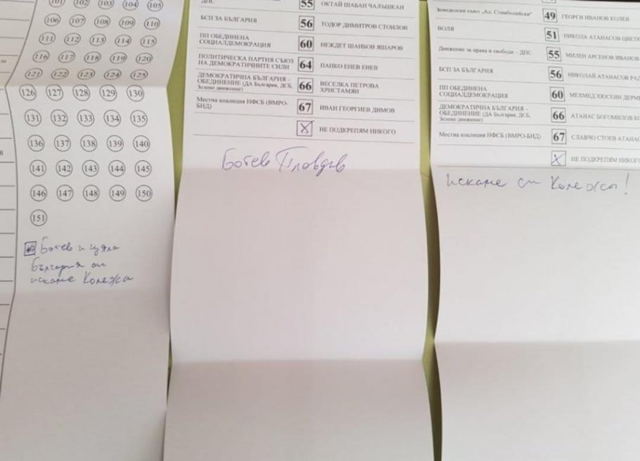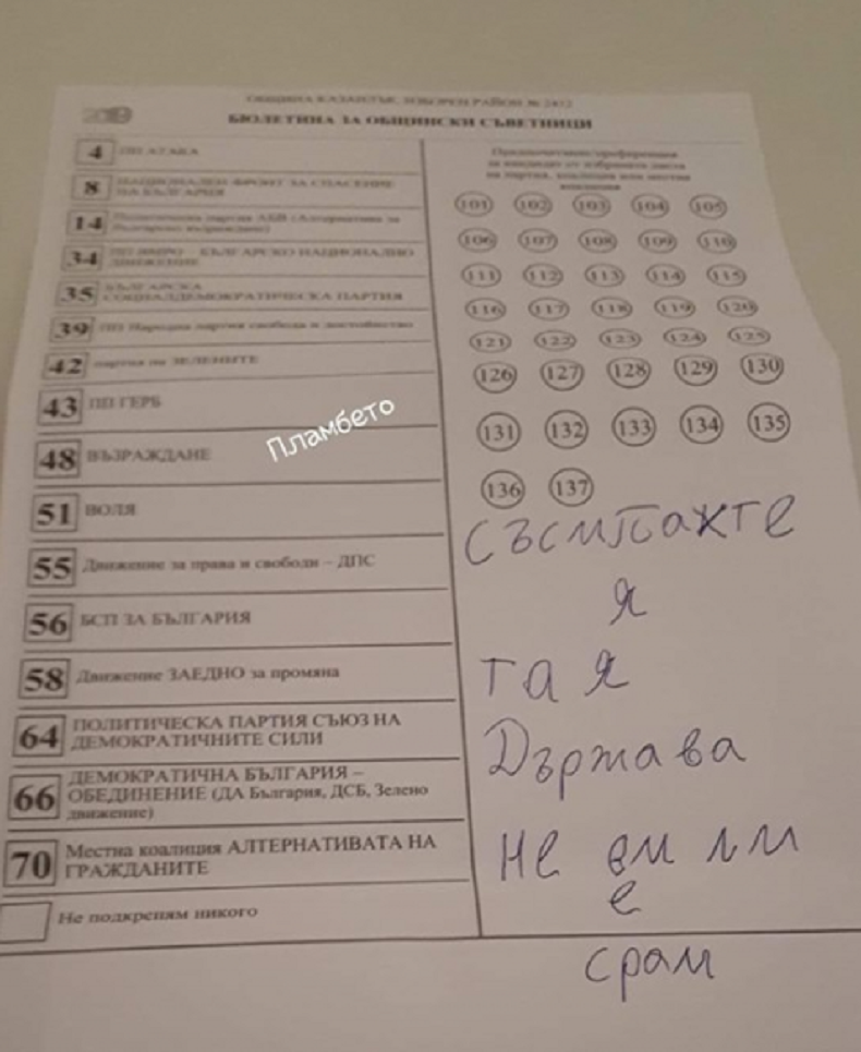 Друг гласоподавател пък очевидно решил да не подкрепи никого написа върху бюлетината „Съсипахте я тя държава, не ви ли е срам!“.