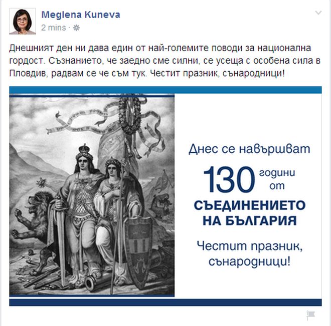 Днешният ден ни дава един от най-големите поводи за национална гордост. Това написа вицепремиерът и лидер на ДБГ Меглена Кунева по случай националния празник 6 септември (Съединението) в своя "Фейсбук" профил.