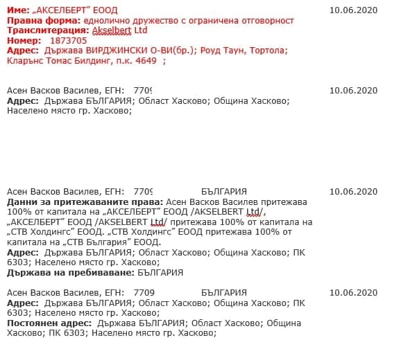 1. „АКСЕЛБЕРТ” Държава ВИРДЖИНСКИ О-ВИ(бр.); Роуд Таун, Тортола; Кларънс Томас Билдинг, п.к. 4649