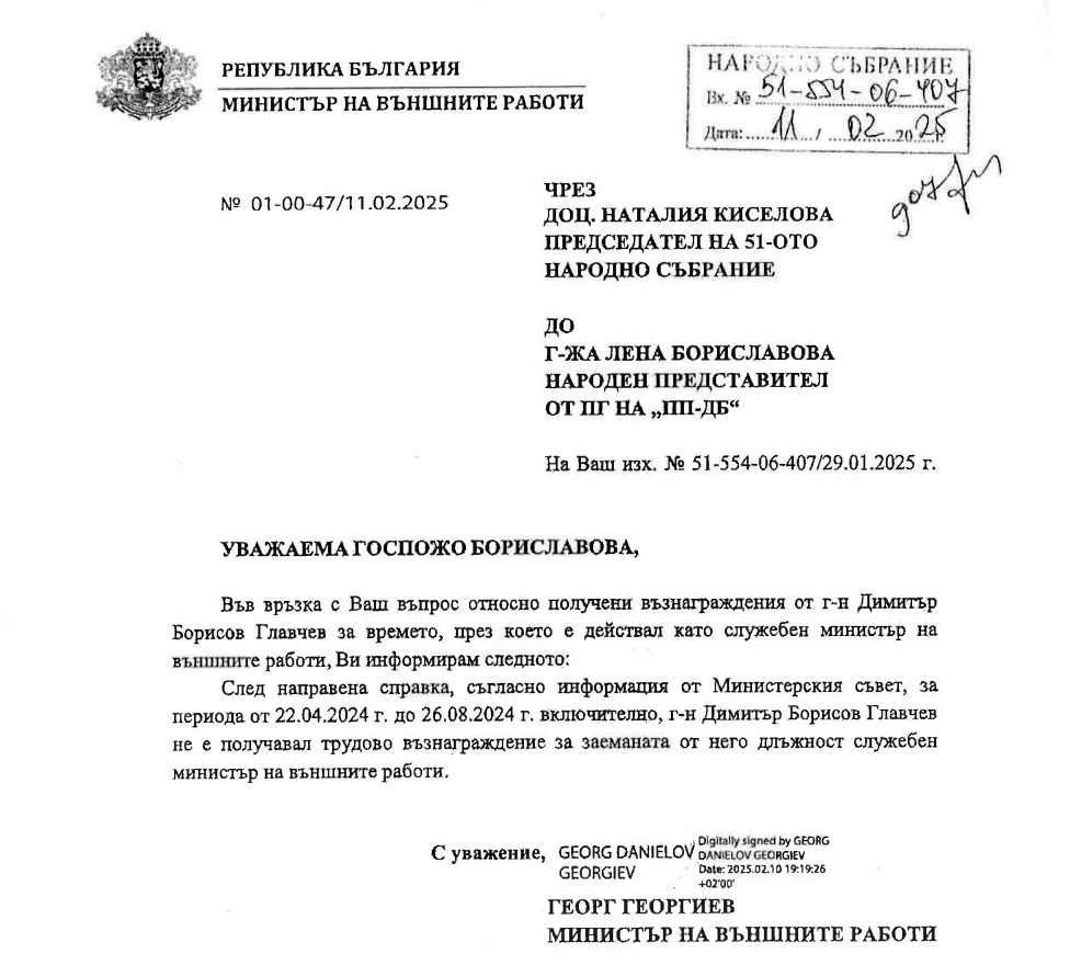Като такъв, за периода април - август 2024 г., Димитър Главчев не е получавал трудово възнаграждение за заеманата от него длъжност, се посочва изрично в отговора на министър Георгиев до Лена Бориславова.