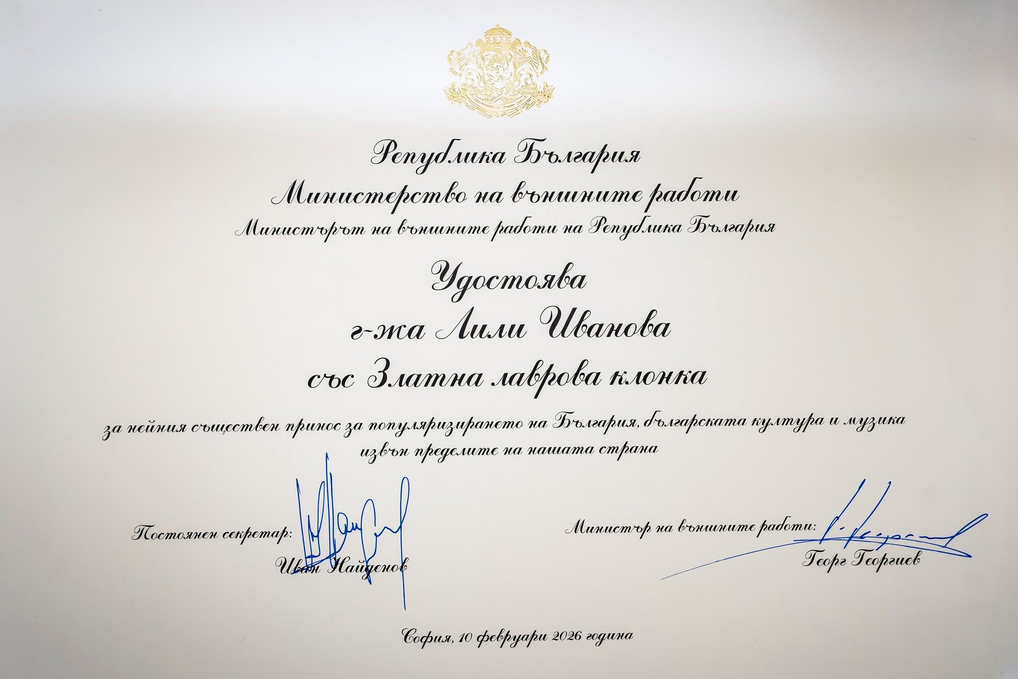Примата на българската попмузика Лили Иванова получи почетния знак „Златна лаврова клонка“ на Министерството на външните работи на Република България, връчен от министър Георг Георгиев на тържествена церемония в сградата на министерството.