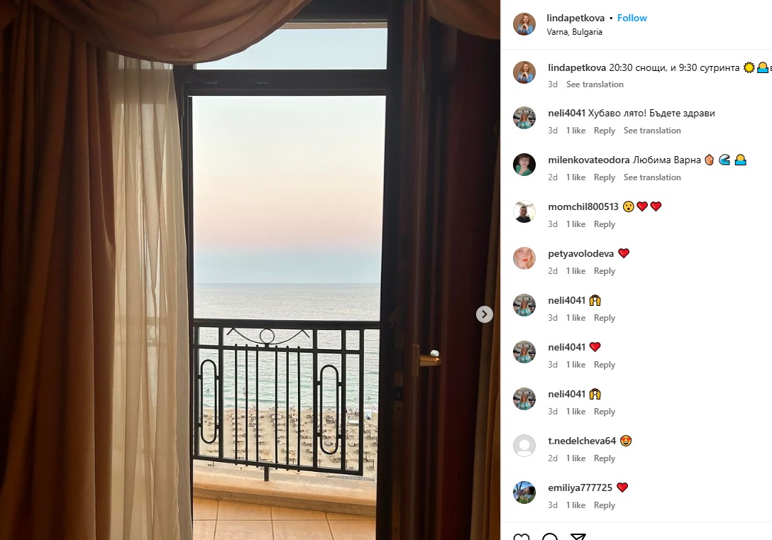 Снимките са от терасата на хотел във Варна и са направени през уикенда. На двата кадъра се виждат плажът и морето, а Линда Петкова уточнява, че едната снимка е направена в 20:30 часа вечерта, а другата в 9:30 сутринта на следващия ден.