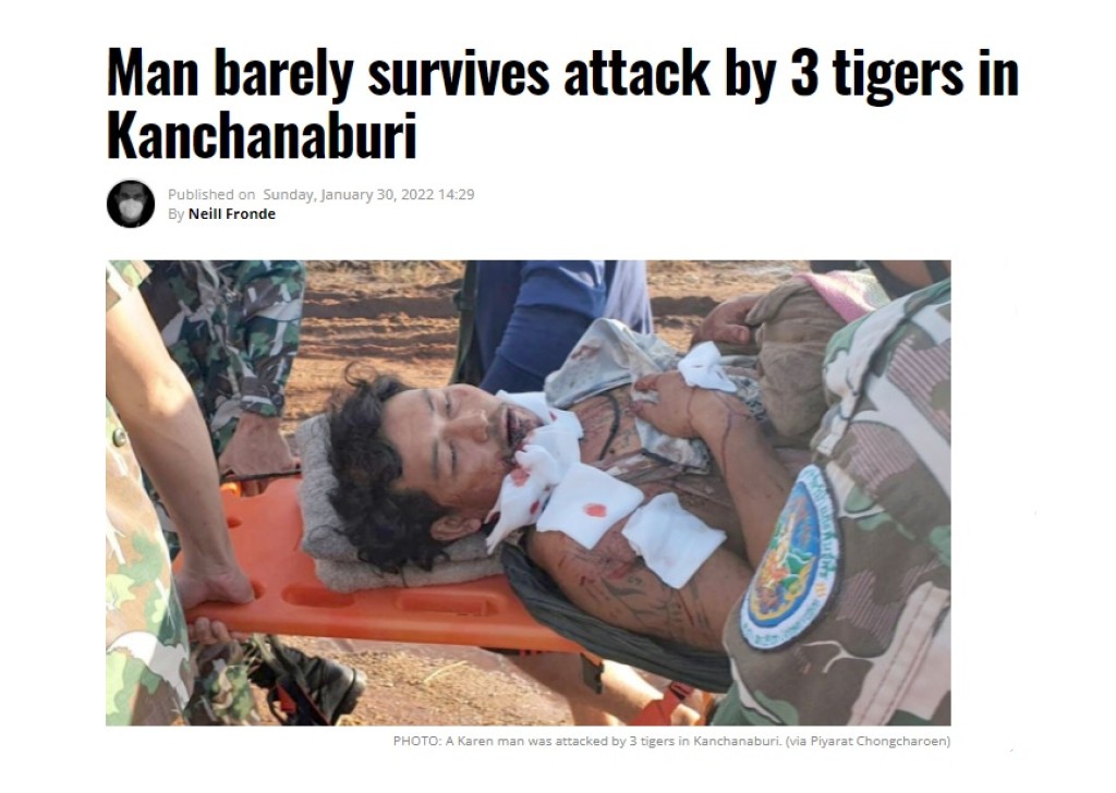 Мъж оцеля по чудо, след като беше нападнат от три тигъра в западната тайландска провинция Канчанабури, съобщава вестник „Бангкок пост“.