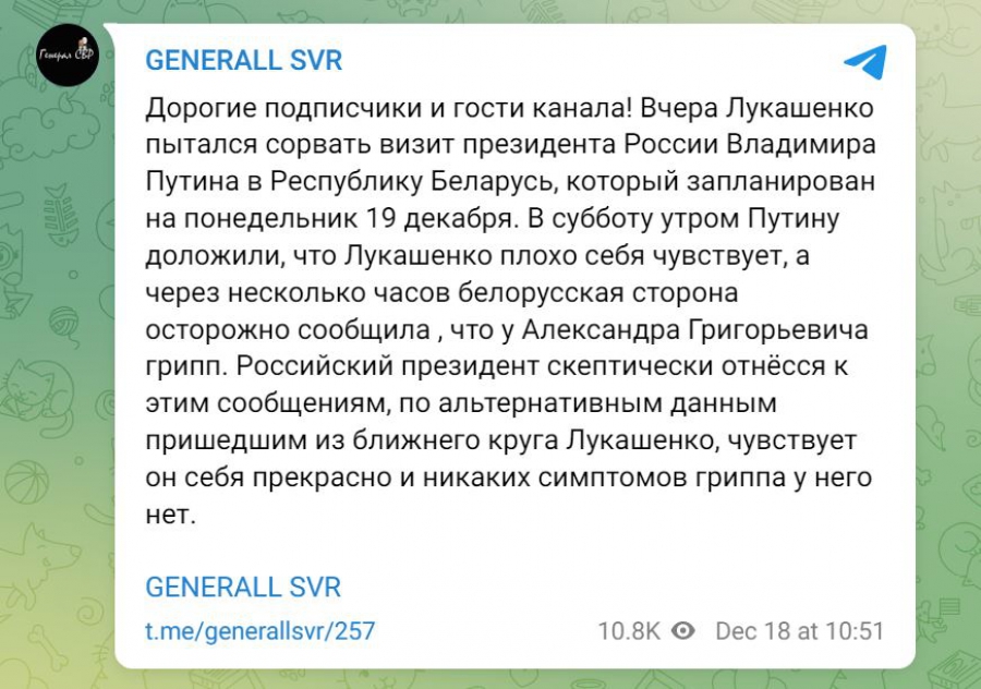 Беларуският президент Александър Лукашенко се престори на болен от грип в опит да избегне посещението в Минск на руския диктатор Владимир Путин. Това съобщи каналът "Генерал СВР" в Telegram, за който се твърди, че е на бивш генерал от Службата за външно разузнаване на Руската федерация, който има достъп до вътрешна информация в Кремъл.