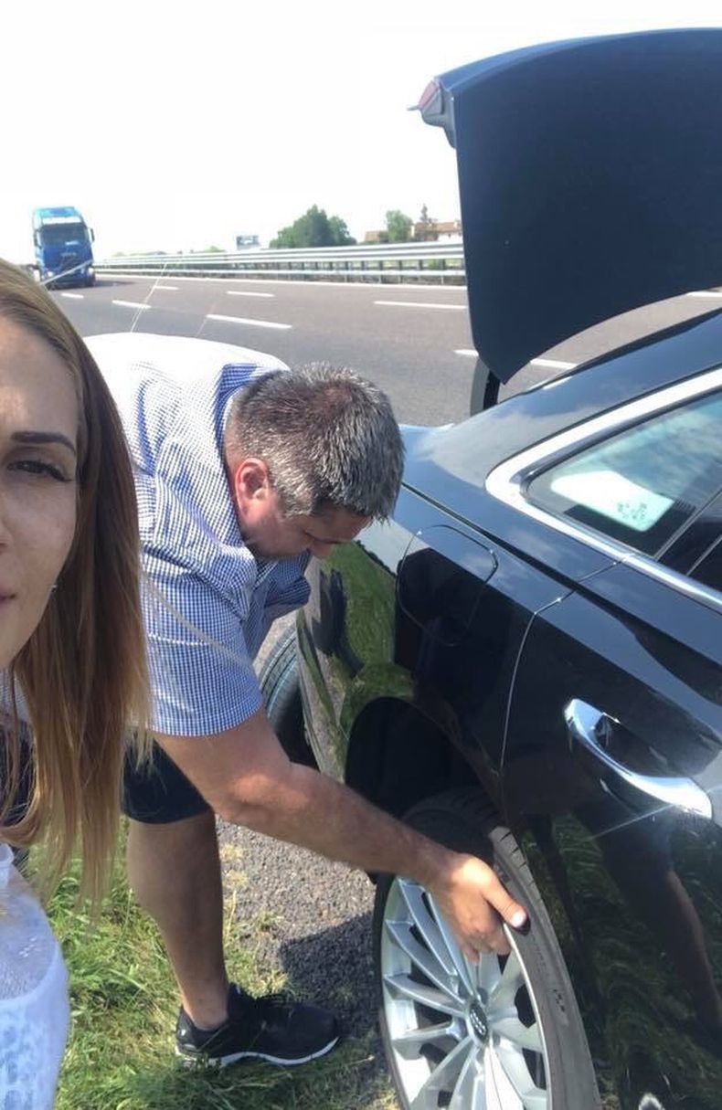 "Да си вземеш новата А8 от Hertz с пирон - екстра и да спукаш гума на магистралата на 40-градусова жега. Първи път смяна на гума и с общи усилия за 10 мин.", написа русокосата хубавица във Фейсбук.