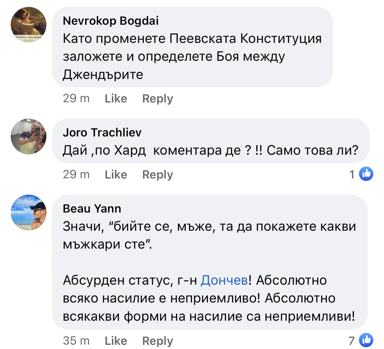 "Значи, "бийте се, мъже, та да покажете какви мъжкари сте". Абсурден статус, г-н Дончев! Абсолютно всяко насилие е неприемливо! Абсолютно всякакви форми на насилие са неприемливи!", заяви под публикацията на политика Beau Yann.