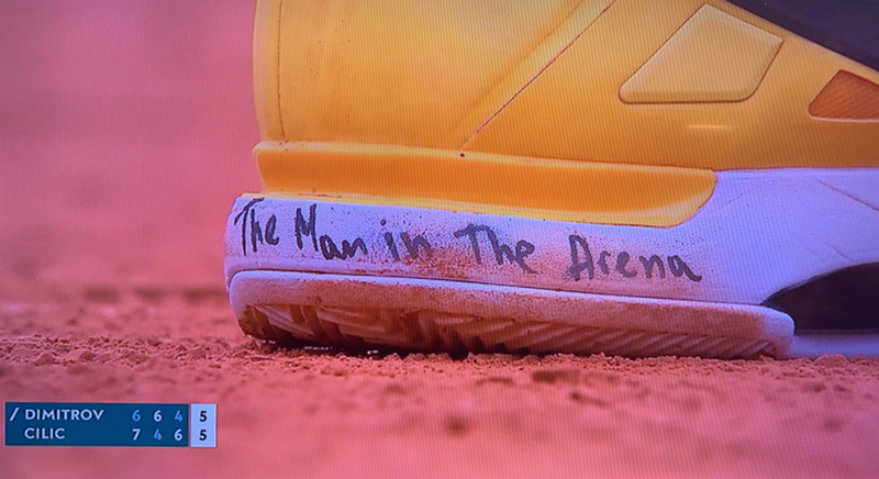 По време на мача с хърватина впечатление направи любопитен надпис на маратонките на Димитров – "The Man in The Arena" ("Мъжът на арената").