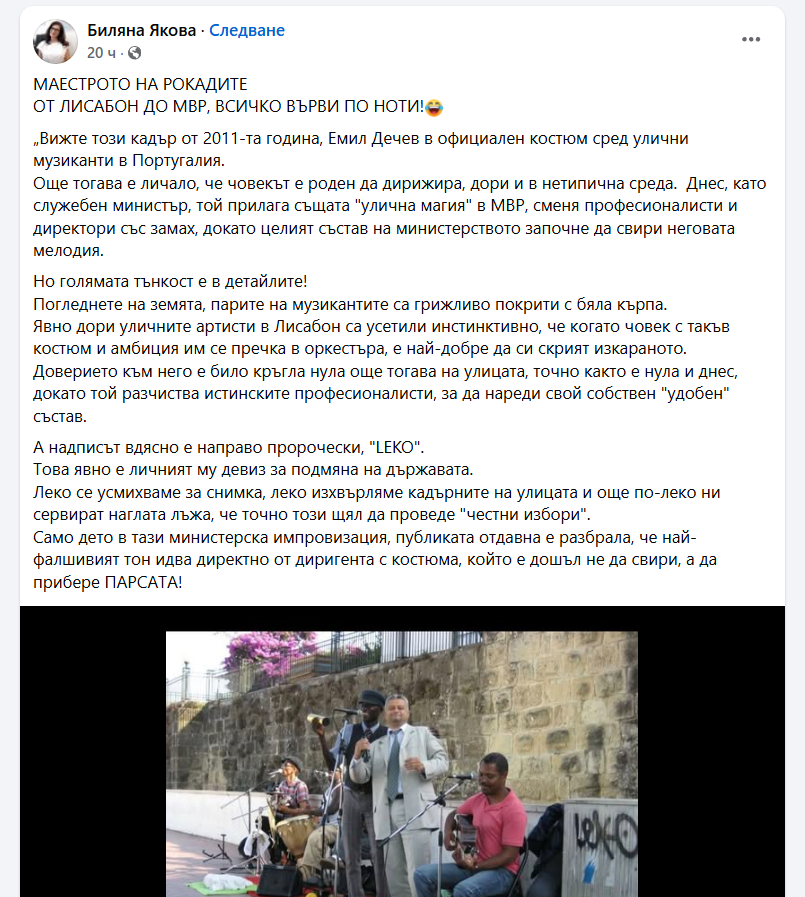 Още тогава е личало, че човекът е роден да дирижира, дори и в нетипична среда. Днес, като служебен министър, той прилага същата "улична магия" в МВР, сменя професионалисти и директори със замах, докато целият състав на министерството започне да свири неговата мелодия", коментира варненската общественичка в социалната мрежа.