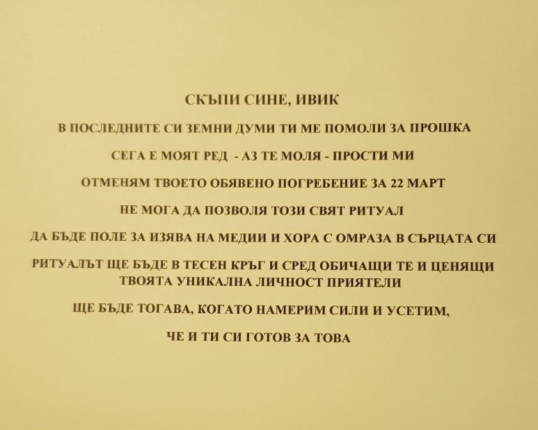 Днес той е споделил снимка на бележка, на която пише: Скъпи сине, Ивик. В последните си земни думи ти ме помоли за прошка. Сега е моят ред - аз те моля, прости ми. Отменям твоето обявено погребение за 22 март. Не мога да позволя този свят ритуал да бъде поле за изява на медии и хора с омраза в сърцата си. Ритуалът ще бъде в тесен кръг и сред обичащите те и ценящи твоята уникална личност приятели. Ще бъде тогава, когато намерим сили и усетим, че и ти си готов за това.