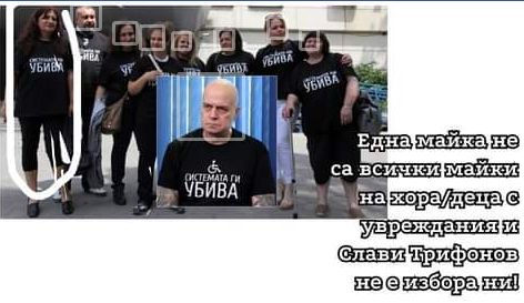 Майката на дете с увреждания Рени Григовора реагира остро срещу опита на кандидат политици и бутикови организации да ползват децата им и хората с увреждания, за да трупат рейтинг. Поводът е циркът на Слави Трифонов с черните му фланерки, от които тя се погнусила.