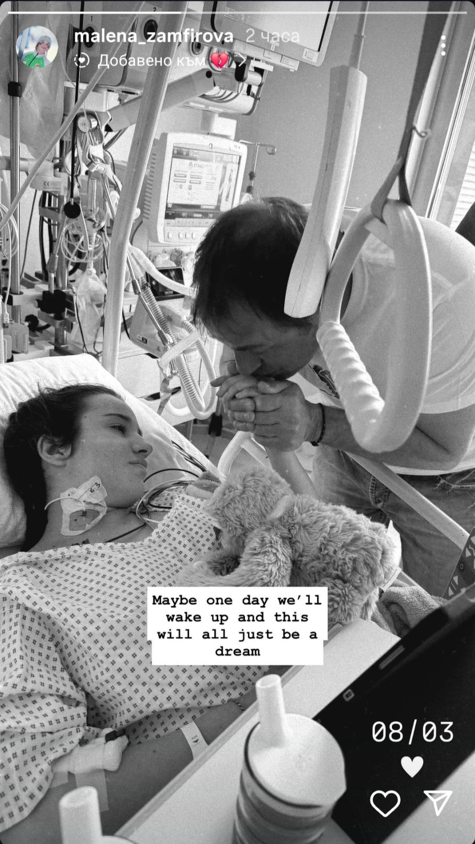 На снимката се вижда 16-годишната спортистка в болничното легло, придружена от баща си, а посланието към нея гласи: “Може би един ден ще се събудим и всичко това ще бъде просто сън“.