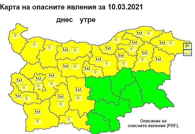 В 22 области на страната е обявен жълт код за валежи от дъжд и сняг на 10 март. Това показва справка на сайта на Националния институт по метеорология и хидрология (НИМХ).