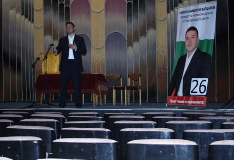 Никола Вапцаров „изнася“ пламенна реч пред празна зала на предизборната си кампания в Банско, която бе абсолютно фиаско.