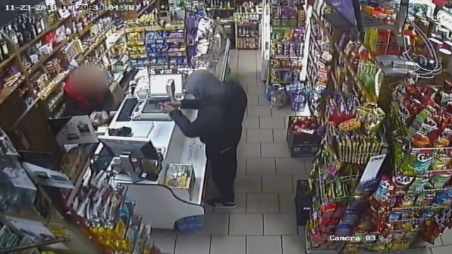 Той е имал съучастник, който минути преди това влиза в магазина и пазарува. Той е облечен със зелено яке, носи шапка на главата, обут е със сиви обувки и носи раница.